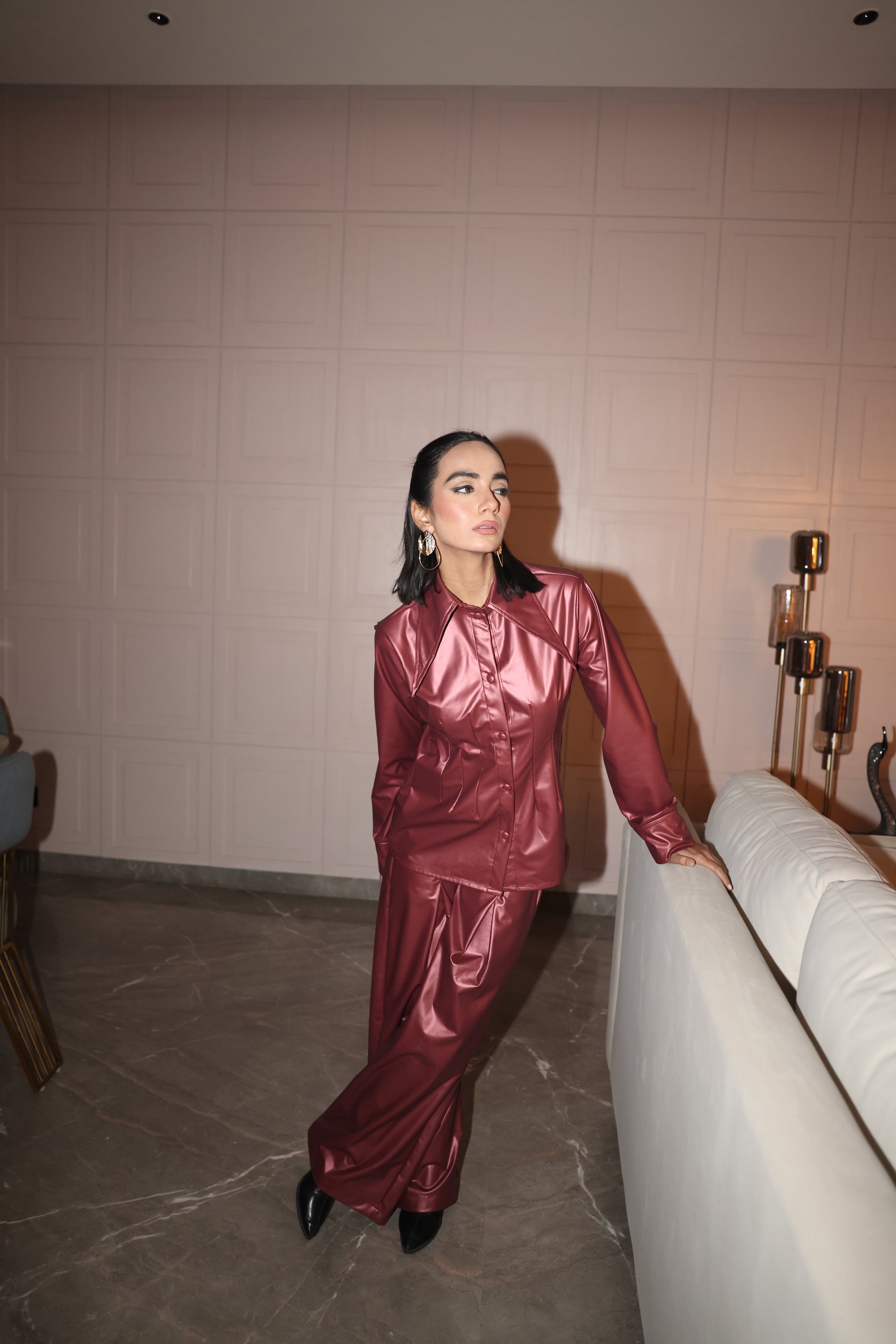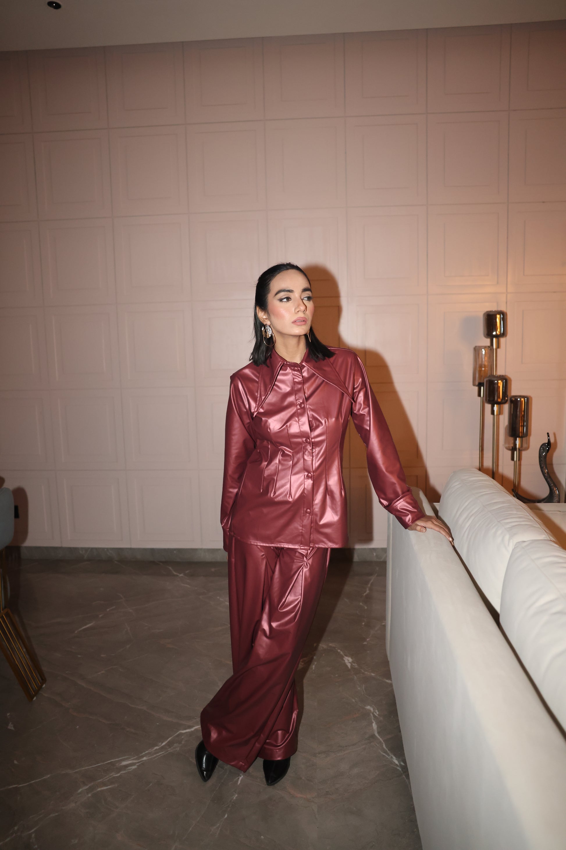 Sleek, structured, and designed to catch the light — the Crimson Sculpt Leather Set brings high-impact glamour to every step. Crafted in luxe faux leather with a liquid-sheen finish, the shirt features sculpted panel lines that contour the form, paired with wide-leg trousers that glide effortlessly. It’s bold yet refined, perfect for nights where confidence becomes the outfit