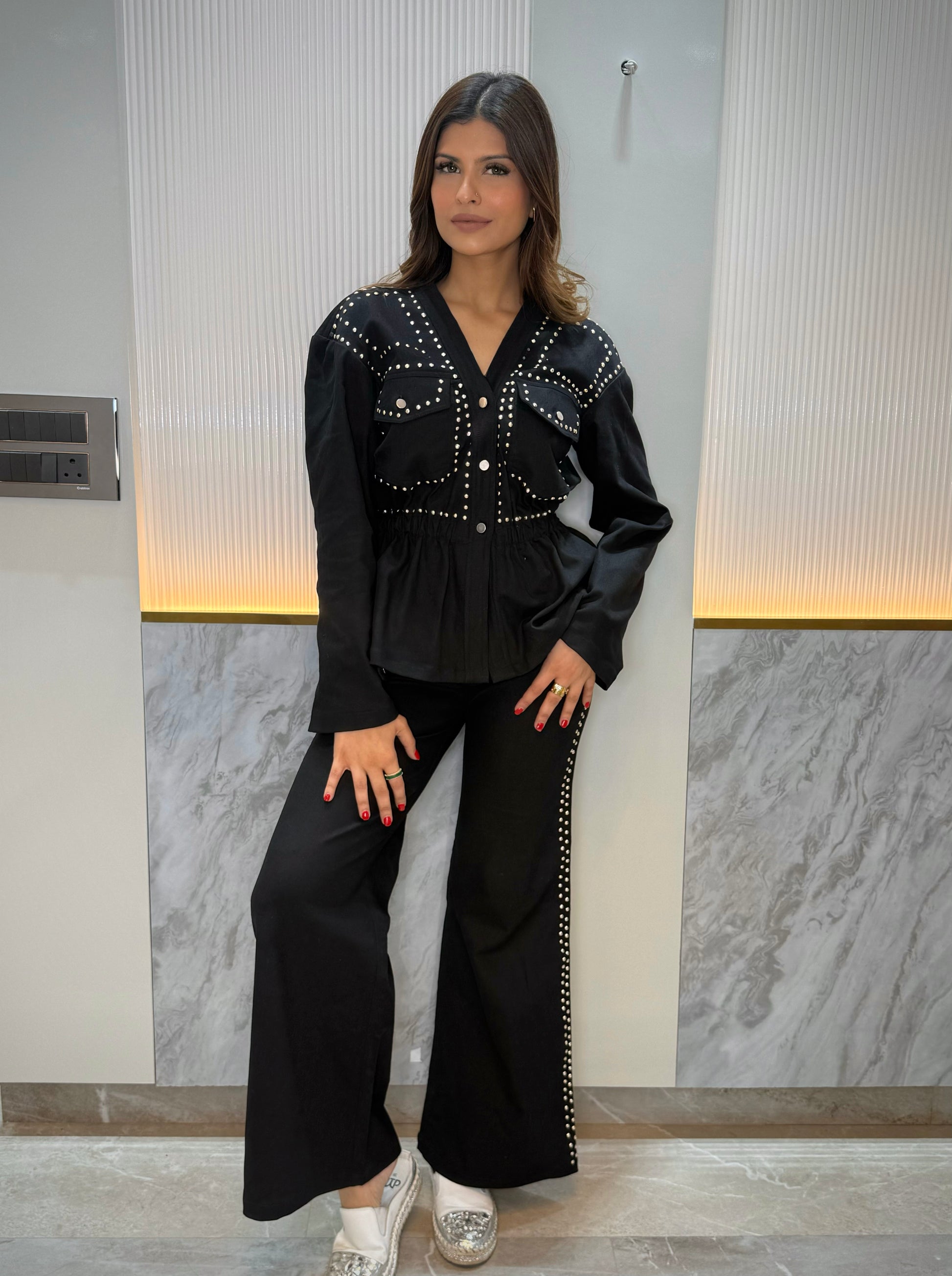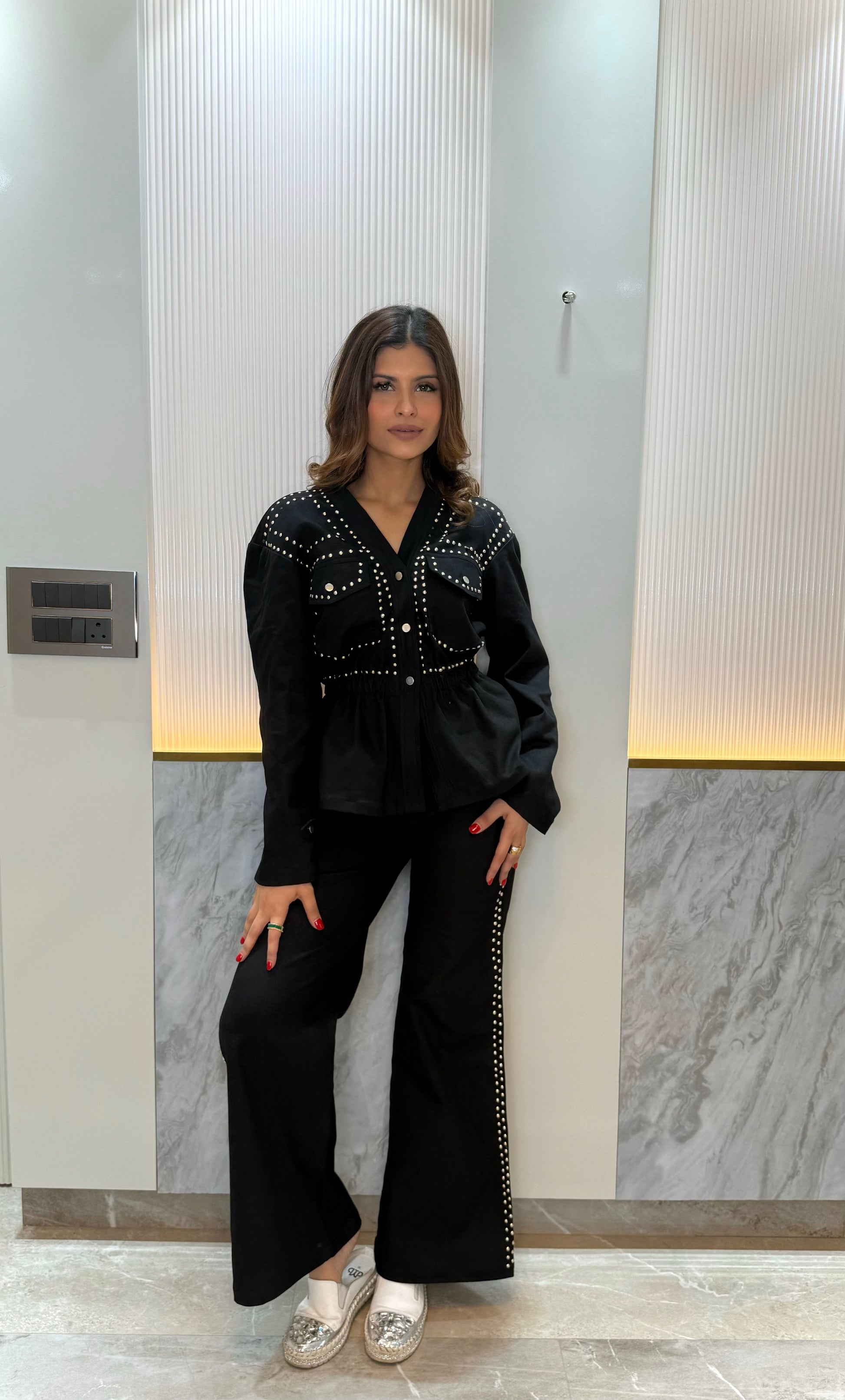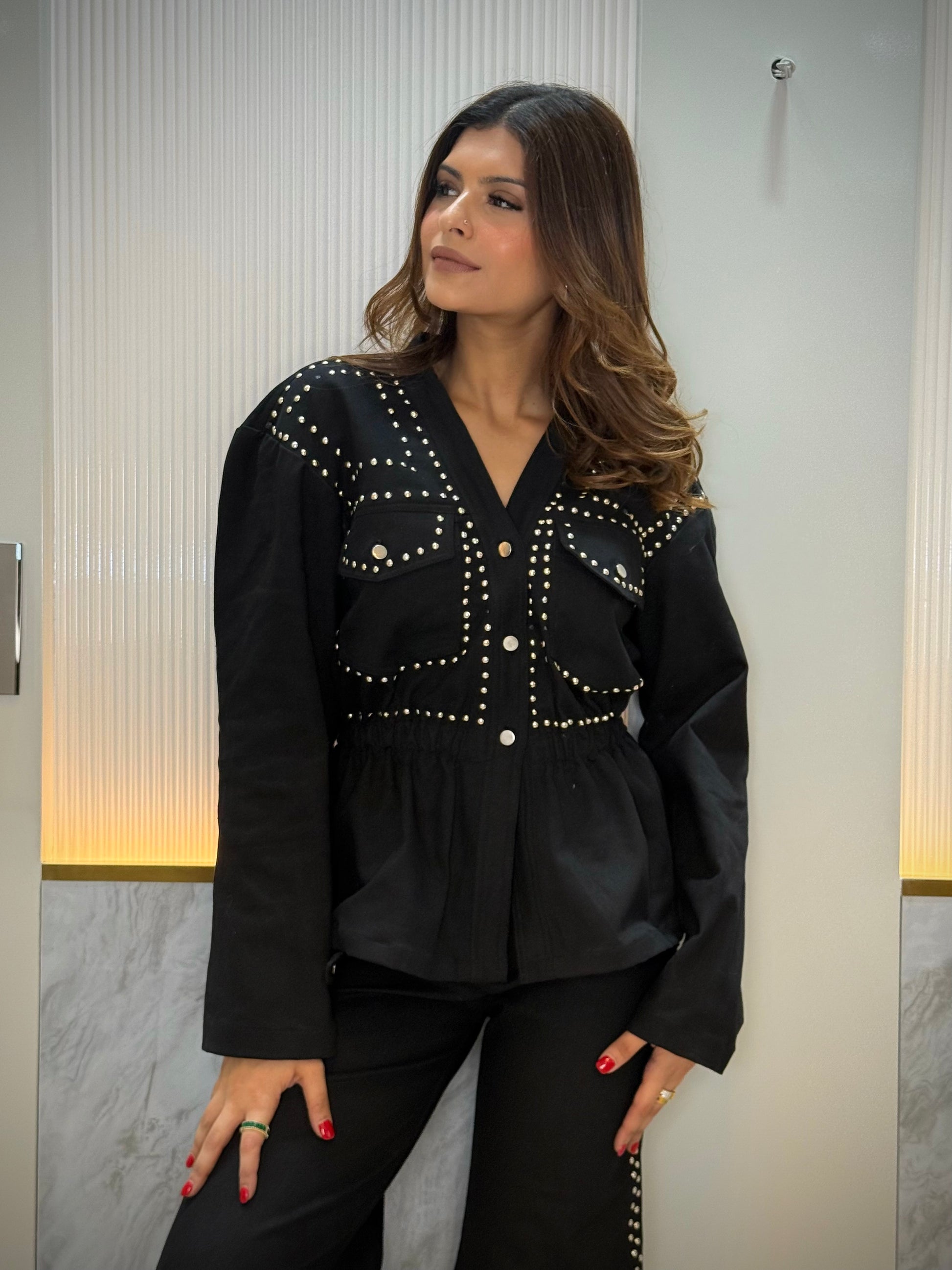 Command the spotlight in the Rivet and Rule Set — a sleek black denim corset paired with its matching bottoms, accentuated by a trail of gleaming silver rivets. The structured peplum silhouette flatters the waistline with just the right balance of edge and elegance. Designed for the bold and beautifully refined, this set is your go-to for making an effortless yet unforgettable statement. Whether you're heading to a soirée or elevating your everyday wardrobe, this look is made to empower.